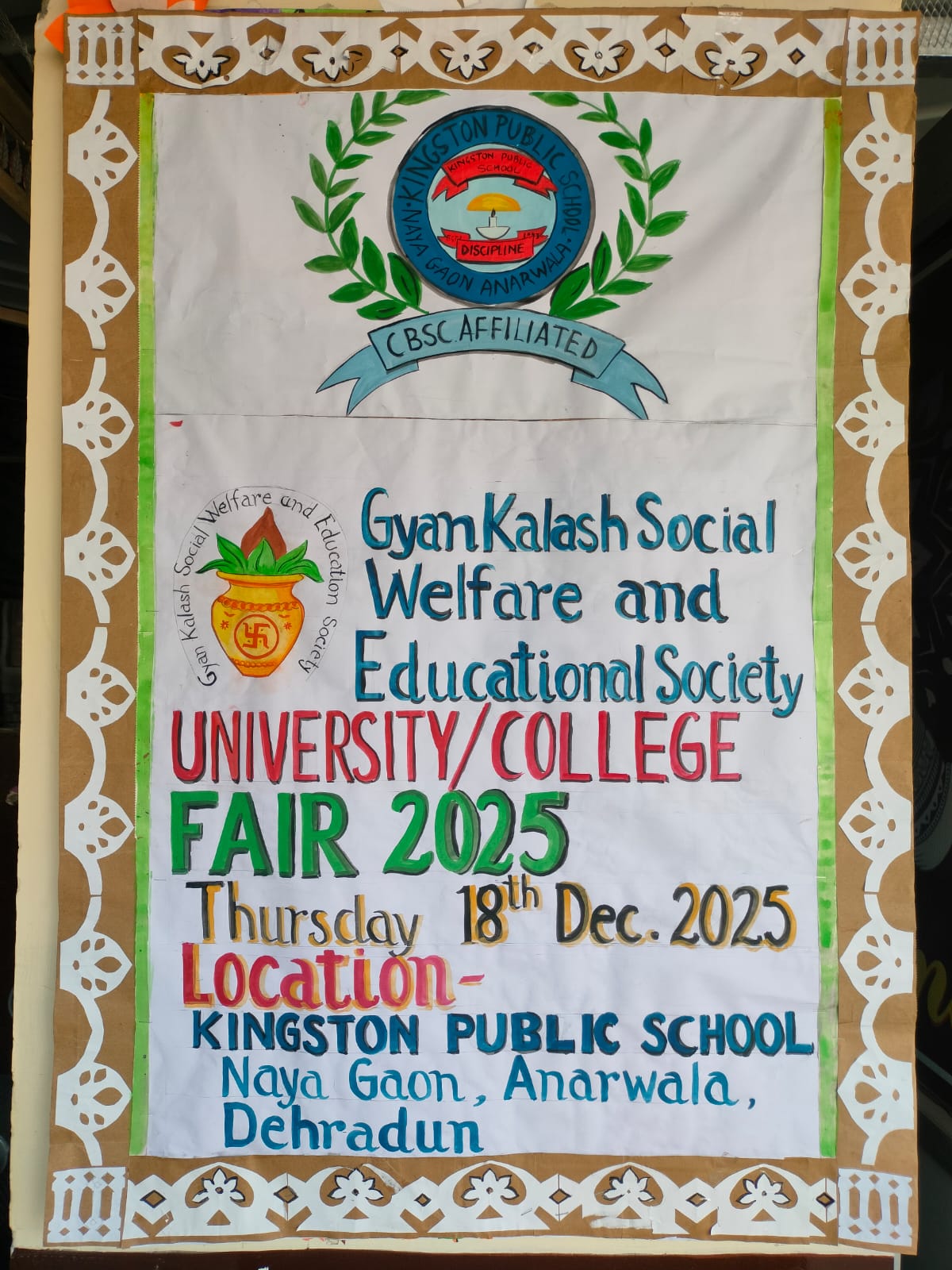 देहरादून। ज्ञान कलश सोशल वेलफेयर एंड एजुकेशनल सोसाइटी द्वारा किंग्सटन पब्लिक स्कूल, अनारवाला, देहरादून के सहयोग से विश्वविद्यालय/कॉलेज फेयर 2025 का सफल आयोजन किया गया। इस फेयर का उद्देश्य विद्यार्थियों, अभिभावकों और संरक्षकों को करियर मार्गदर्शन, उच्च शिक्षा से जुड़ी जानकारी तथा प्रतिष्ठित विश्वविद्यालयों और कॉलेजों के साथ प्रत्यक्ष संवाद के लिए एक प्रभावी मंच प्रदान करना था। यह आयोजन 18 दिसंबर 2025 को प्रातः 9:00 बजे से दोपहर 1:00 बजे तक किंग्सटन पब्लिक स्कूल परिसर में संपन्न हुआ।
