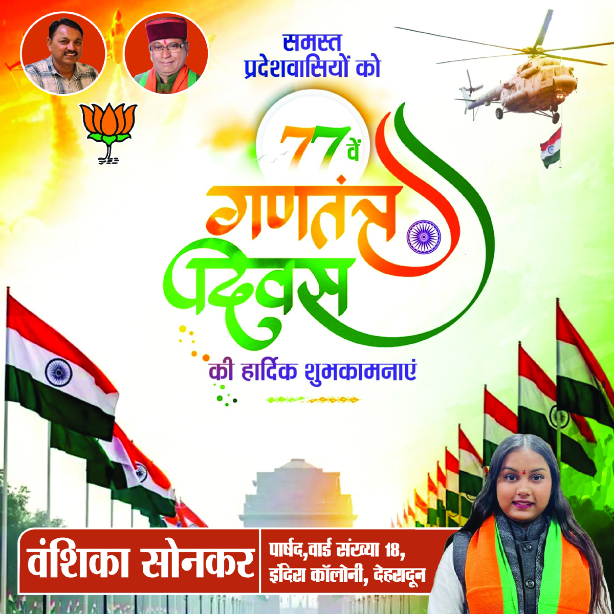 देहरादून। आज 26 जनवरी है और देशभर में 77वां गणतंत्र दिवस धूमधाम से मनाया जा रहा है। देश के इस पावन पर्व के अवसर पर युवा भाजपा नेत्री, प्रसिद्ध समाजसेवी एवं वार्ड संख्या 18 इंदिरा कॉलोनी की नगर निगम पार्षद वंशिका सोनकर ने समस्त देशवासियों को हार्दिक बधाई एवं शुभकामनाएं दी हैं।