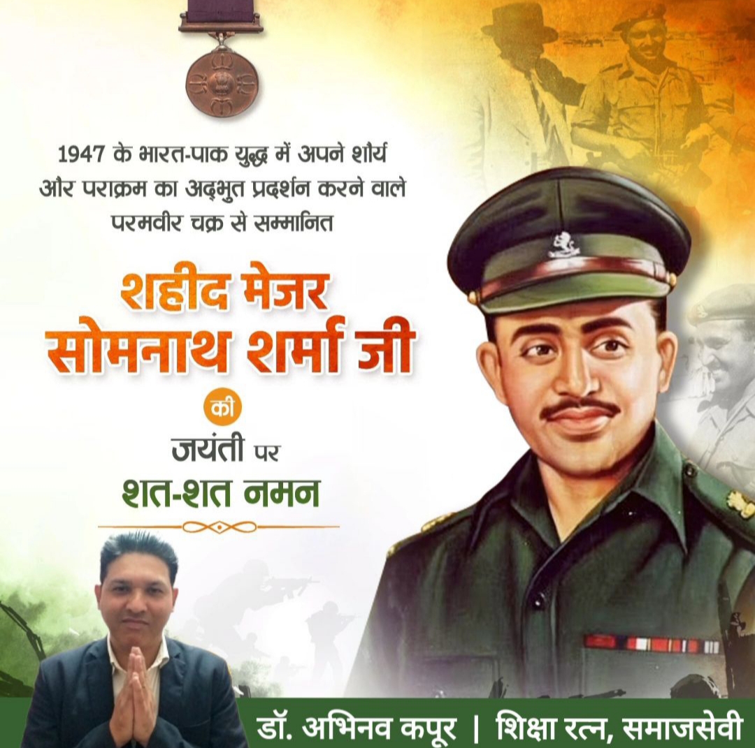 जनसेवी डॉ. अभिनव कपूर ने कहा- अदम्य साहस, अद्वितीय शौर्य और मातृभूमि के प्रति अटूट समर्पण के प्रतीक, परमवीर चक्र से अलंकृत अमर सपूत मेजर सोमनाथ शर्मा जी की जयंती पर उन्हें भावपूर्ण श्रद्धांजलि। राष्ट्र की अखंडता और स्वाभिमान की रक्षा हेतु मेजर सोमनाथ शर्मा जी का सर्वोच्च बलिदान इतिहास के पन्नों में सदैव स्वर्णाक्षरों में अंकित रहेगा।