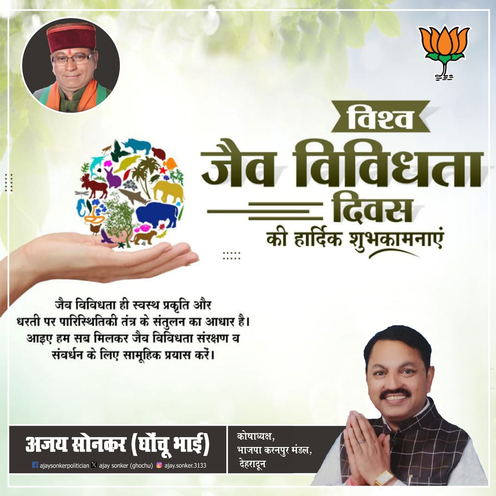 देहरादून। वरिष्ठ भाजपा नेता, प्रसिद्ध जनसेवी एवँ वार्ड संख्या 18 इंदिरा कॉलोनी, चुक्खुवाला के पूर्व नगर निगम पार्षद अजय सोनकर उर्फ घोंचू भाई ने “विश्व जैव विविधता दिवस” के अवसर पर समस्त देश वासियों को हार्दिक बधाई एवं शुभकामनाएं देते हुए विशेष संदेश दिया है।