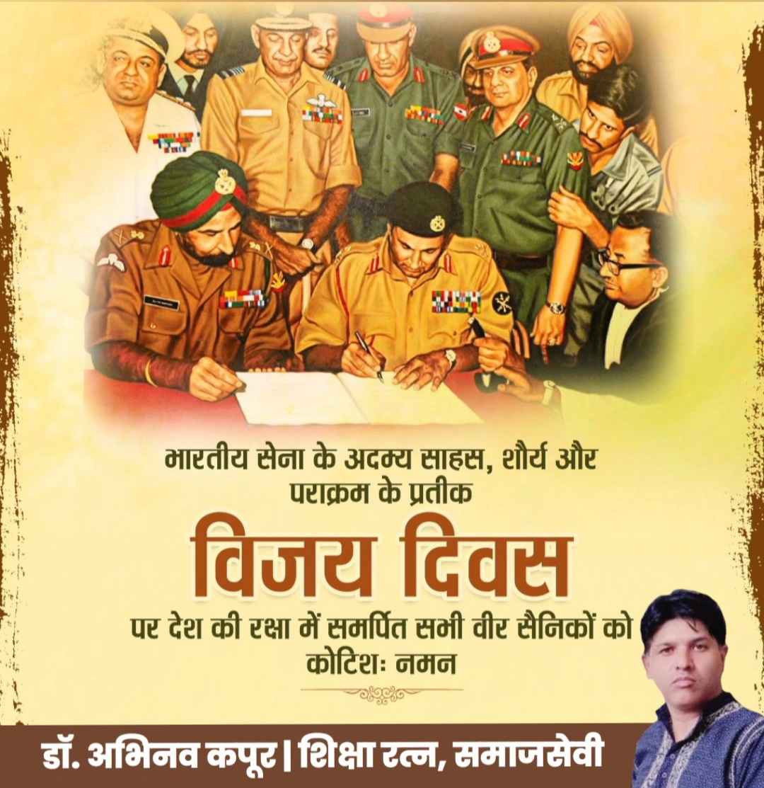 शिक्षा रत्न डॉ. अभिनव कपूर ने कहा कि वर्ष 1971 में आज ही के दिन पाक सेना ने हमारे वीर सैनिकों की वीरता के समक्ष आत्मसमर्पण किया था। विजय दिवस सेना के शौर्य व पराक्रम का दिवस है। आज का दिन भारत और पाकिस्तान के बीच हुए युद्ध में भारतीय सेना की जयघोष का दिन है।