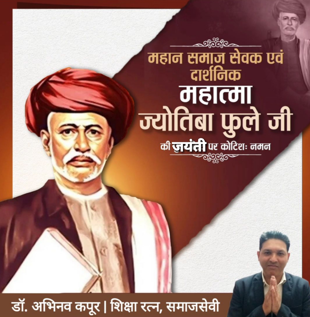 इस अवसर पर जारी अपने संदेश में जनसेवी डॉ. अभिनव कपूर ने कहा- देश में सामाजिक क्रांति के अग्रदूत महात्मा ज्योतिबा फुले जी की जयंती पर उन्हें कोटिशः वंदन। उन्होंने गरीब, दलित व पिछड़े वर्ग के उत्थान तथा सामाजिक जड़ताओं व कुरीतियों को दूर करने के लिए अपना जीवन समर्पित कर दिया। साथ ही महिलाओं के कल्याण व उनकी शिक्षा को बढ़ावा देने में भी अहम योगदान दिया।